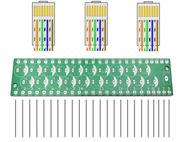 Placuta adaptor de la mufa utp la fire. Inlocuieste operatia de sertizare cablu utp la controler. Firele se lipesc direct pe placa.